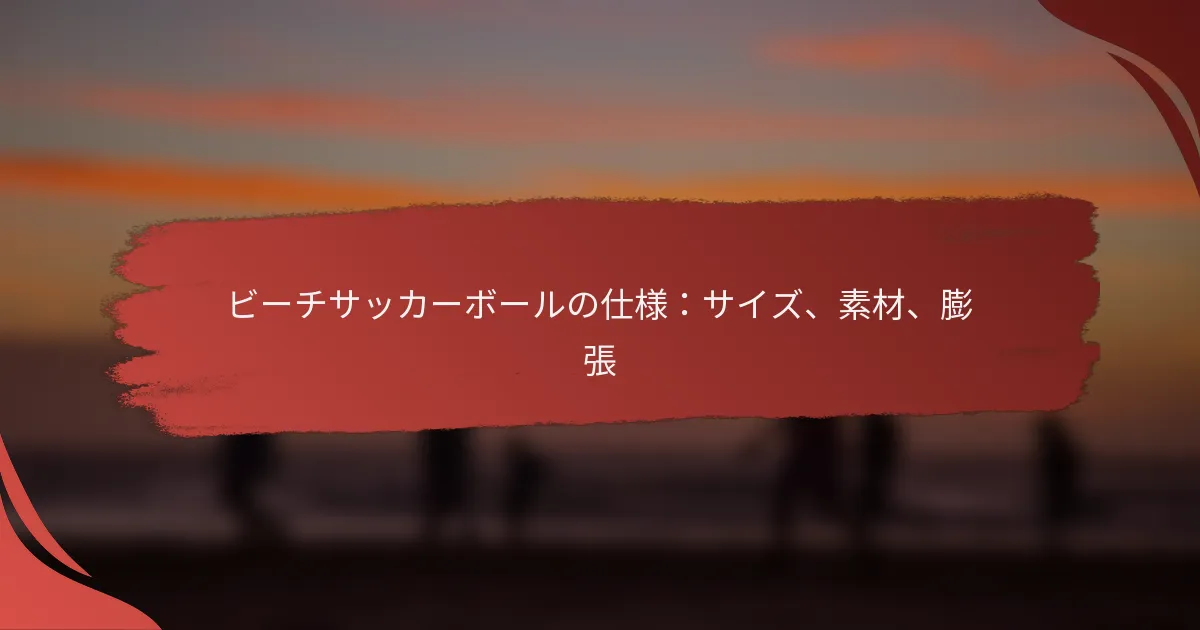 ビーチサッカーボールは、主に3、4、5のさまざまな標準サイズで設計されており、サイズ5が大人や競技プレイの公式な選択肢となっています。PVC、ゴム、または合成化合物などの材料で構成されており、これらのボールは異なるプレイスタイルに対応するユニークなパフォーマンス特性を提供します。適切な空気圧での膨張は、ボールの形状と反応性を維持するために重要であり、最適なプレイ体験を確保します。 ビーチサッカーボールの標準サイズは何ですか? ビーチサッカーボールは、異なる年齢層やスキルレベルに合わせたさまざまな標準サイズで提供されています。最も一般的なサイズは3、4、5で、サイズ5が大人や競技プレイの公式サイズです。 異なる年齢層の公式サイズ仕様 ビーチサッカーボールは、異なる年齢層やスキルレベルのプレイヤーに対応するためにサイズで分類されています。一般的に認識されている仕様は以下の通りです: サイズ3:6歳以下の子供向けに設計されたこの小さなボールは、若いプレイヤーが扱いやすくなっています。 サイズ4:7歳から12歳のプレイヤーに適しており、このサイズはコントロールとプレイのバランスを提供します。 サイズ5:13歳以上のプレイヤー、つまり大人向けの公式サイズであり、競技試合で使用されます。 レクリエーションプレイと競技プレイのサイズ比較 レクリエーション環境では、プレイヤーは年齢やスキルレベルに基づいてサイズ4または5のボールを選ぶことがよくあります。サイズ5は通常、大人のゲームで好まれ、サイズ4はユースリーグで人気があります。競技プレイではサイズ5のボールの使用が義務付けられており、試合の均一性が確保されます。 レクリエーションプレイでは、サイズ選択においてより柔軟性が許可され、プレイヤーは快適に感じるボールを選ぶことができます。しかし、公式トーナメントでは、サイズ規則を遵守することが公平性と一貫性のために重要です。 サイズがゲームプレイとプレイヤーのパフォーマンスに与える影響 ビーチサッカーボールのサイズは、ゲームプレイのダイナミクスに大きな影響を与えます。サイズ5のような大きなボールは、経験豊富なプレイヤーにとって視認性とコントロールを向上させ、パフォーマンスを高めます。逆に、小さなボールは若いプレイヤーにとって扱いやすく、スキルの発展を促進します。 サイズは、キック力やボールの速度にも影響を与えます。サイズ5のボールはより速く移動し、効果的にキックするためにはより多くの力が必要ですが、サイズ4のボールは操作が容易で、技術の発展に役立ちます。 異なるスキルレベルに適したサイズの選び方 適切なビーチサッカーボールのサイズを選ぶことは、楽しみとスキルの発展を最大化するために重要です。若いプレイヤーや初心者には、学習とコントロールを促進するためにサイズ3または4のボールが推奨されます。プレイヤーが成長し、スキルが向上するにつれて、サイズ5への移行が望ましいです。 サイズを選ぶ際には、プレイヤーの年齢、スキルレベル、プレイの種類(レクリエーションまたは競技)を考慮してください。異なるサイズを試すことで、プレイヤーは自分の快適さとパフォーマンスに最適なフィットを見つけることができます。 サイズに関する一般的な誤解 多くの人は、小さなボールは若いプレイヤー専用だと考えていますが、サイズ4のボールは年配の初心者にも有益です。彼らはスキルをまだ発展させている人々にとって扱いやすいサイズを提供します。 もう一つの誤解は、大きなボールを使用することで自動的にパフォーマンスが向上するというものです。サイズ5のボールは大人にとって標準ですが、プレイヤーはサイズだけでなく快適さとコントロールを優先すべきです。 最後に、すべてのビーチサッカーボールが同じだと考える人もいますが、実際にはサイズや材料の違いがプレイアビリティに大きく影響するため、意図した使用に適したボールを選ぶことが重要です。 ビーチサッカーボールにはどのような材料が使用されていますか? ビーチサッカーボールは通常、PVC、ゴム、または合成材料で作られており、それぞれがパフォーマンス、耐久性、取り扱いに影響を与える特性を持っています。これらの材料を理解することで、プレイヤーは自分のニーズに合ったボールを選ぶことができます。 一般的な材料の概要:PVC、ゴム、合成オプション PVC(ポリ塩化ビニル)は、耐久性と防水性からビーチサッカーボールに人気の選択肢です。パフォーマンスとコストの良いバランスを提供し、カジュアルなプレイヤーにもアクセスしやすくなっています。 ゴム製のボールは、優れたグリップと柔軟性で知られており、プレイ中のコントロールを向上させることができます。通常はより手頃な価格ですが、PVCに比べて湿った条件ではパフォーマンスが劣ることがあります。 ポリウレタンなどの合成材料は、より優れたタッチと反