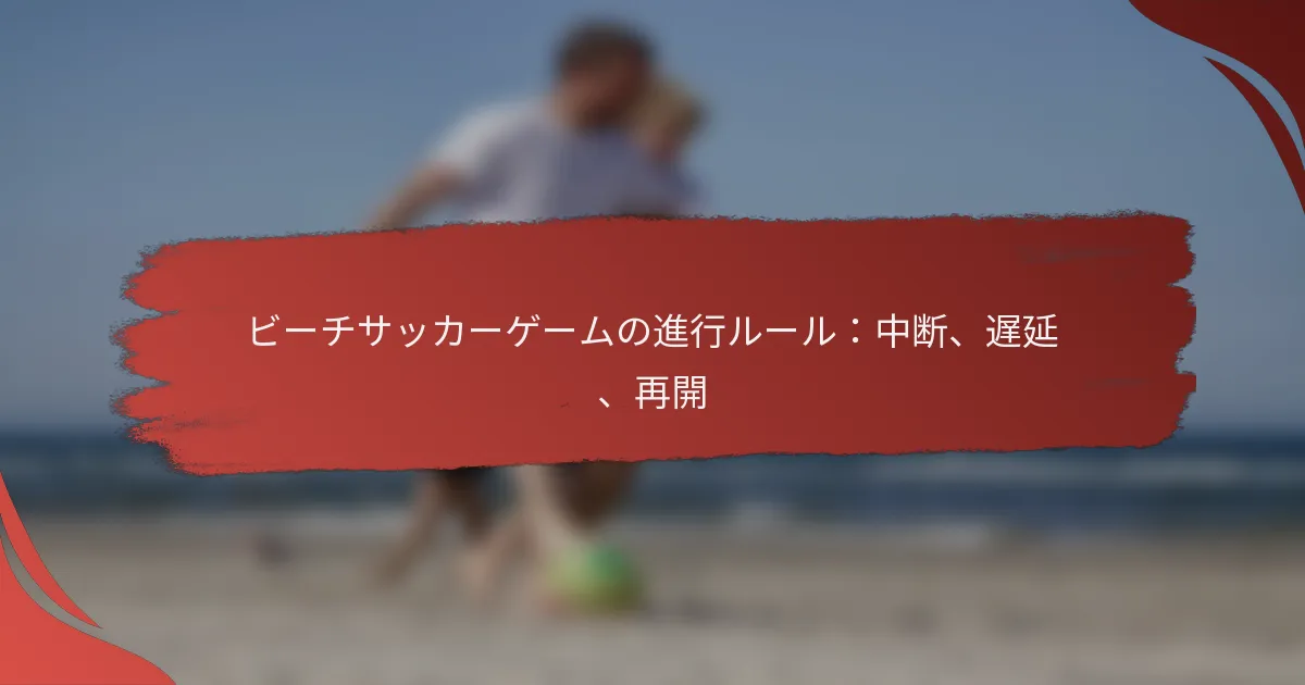 ビーチサッカーの試合では、プレーの流れに影響を与えるさまざまな中断が発生する可能性があり、選手、審判、観客がこれらの状況がどのように管理されるかを理解することが重要です。中断は、怪我、天候条件、または管理上の問題から生じることがあり、それぞれがプレーを再開するための特定のプロトコルを必要とします。これらのルールを遵守することで、安全性と公正性が確保され、いかなる中断の後でも試合がスムーズに続行されることができます。 ビーチサッカーの試合における主要な中断は何ですか? ビーチサッカーの試合では、プレーの流れに影響を与えるさまざまな中断が発生する可能性があります。これらの中断を理解することは、選手、審判、観客が試合がどのように管理され、効果的に再開されるかを把握するために不可欠です。 怪我に関連する中断 怪我に関連する中断は、選手が試合中に負傷した場合に発生します。試合は、医療スタッフが負傷した選手を評価し治療するために一時停止され、その安全が確保されます。これらの中断の期間は、負傷の重症度に応じて数分から長くなることがあります。 審判は、選手が即時の注意を必要としていると判断した場合、タイムアウトを要求する権限を持っています。選手は、続行できない場合はフィールドを離れ、必要に応じて交代を行う必要があることを認識しておくべきです。 天候に関連する中断 天候に関連する中断は、激しい雨、雷、または極端な暑さなど、プレーにとって安全でない条件が発生した場合に呼び出されます。審判は、選手や観客の安全に基づいて試合を中断するかどうかを決定します。これらの中断は、天候条件に応じて数分から数時間続くことがあります。 このような遅延中、選手は水分補給をし、必要に応じて避難所を探すべきです。チームは、潜在的な中断に備えて天気予報を常に確認しておくことが重要です。 試合審判による中断 試合審判による中断は、審判が判定に関する争議を解決したり、他の審判と相談したりする必要がある場合に発生します。これらの中断は通常短時間ですが、深刻な状況が発生した場合は長引くことがあります。審判はすべての問題において最終的な決定権を持ち、公正に試合が進行されることを保証します。 選手は、これらの中断中に審判の権限を尊重し、試合に集中し続けるべきです。審判と選手の間の明確なコミュニケーションは、混乱を最小限に抑え、プレーの流れを維持するのに役立ちます。 選手交代 選手交代は、試合の流れを中断させることがあり、チームが停止中に選手を交代することを可能にします。交代は通常、戦術的な理由や負傷した選手の交代のために行われます。このプロセスは迅速であるべきで、通常は1分を超えないようにして中断を最小限に抑えます。 チームは、選手の疲労や試合のダイナミクスを考慮して、戦略的に交代を計画する必要があります。試合ごとに許可される交代の数を制限する規則を遵守することが重要です。 機器の故障 ゴールポストや試合用ボールの問題など、機器の故障も中断を引き起こす可能性があります。このような問題が発生した場合、機器が修理または交換されるまで試合は一時停止されます。これらの中断の期間は、故障の性質に応じて異なる場合があります。 選手と審判は、遅延を防ぐために試合前に機器を定期的にチェックするべきです。これらの問題に迅速に対処することは、試合のペースを維持し、関与するすべての人にスムーズな体験を提供するために重要です。 ビーチサッカーにおける遅延はどのように定義されますか? ビーチサッカーにおける遅延は、試合の流れに影響を与える中断を指します。これらの遅延は、怪我、天候条件、または管理上の問題など、さまざまな状況から生じる可能性があり、それぞれが効果的にプレーを再開するための特定の取り扱いを必要とします。 遅延の種類:怪我によるタイムアウト 怪我によるタイムアウトは、選手が負傷し医療の注意を必要とする場合に発生します。審判は、選手の安全を確保するために試合を停止する権限を持ち、医療スタッフがフィールド上で負傷した選手を評価し治療することを許可します。 通常、怪我によるタイムアウトは、負傷の重症度に応じて数分間続きます。負傷した選手が続行できない場合は交代され、試合は状況に応じてドロップボールまたはフリーキックで再開されます。 負傷した選手が迅速に治療を受けることを確保する。 過度の怪我によるタイムアウトがチームの勢いを妨げる可能性があることを認識する。 遅延の種類:天候による遅延 天候による遅延は、激しい雨、雷、または強風などの悪天候によって引き起こされる中断です。審判は状況を評価し、安全上の理由から試合を中断するかどうかを決定します。 これらの遅延は、天候の重症度に応じて、短い一時停止から数時間まで大きく異なる場合があります。チームは、条