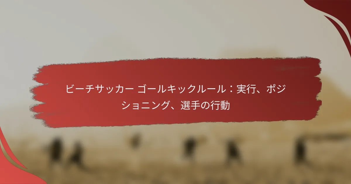 ビーチサッカーにおけるゴールキックは、ボールが攻撃側の選手によって最後に触れられた後にゴールラインを越えた場合に与えられます。ゴールエリア内から実行され、選手の位置取りや行動に関する特定のルールがあり、公正なプレーを維持するために重要です。適切な位置取りとガイドラインの遵守は、キックを行うチームと相手選手の両方にとって、スムーズで秩序あるキックの実行を確保するために重要です。 ビーチサッカーにおけるゴールキックの実行ルールは何ですか? ビーチサッカーにおけるゴールキックは、ボールが攻撃側の選手によって最後に触れられた後にゴールラインを越えてプレーが中断された場合に与えられます。キックはゴールエリア内から行われ、実行、位置取り、選手の行動に関する特定のルールがあり、公正なプレーを確保します。 ビーチサッカーにおけるゴールキックの定義 ゴールキックは、攻撃側のチームが得点できなかった後にプレーを再開する方法であり、ボールがゴールラインを越えた場合に行われます。守備側のチームがボールを奪い、プレーを開始することが重要です。キックはゴールの前にある指定されたスペースであるゴールエリアから行われます。 ボールは静止している必要があり、キックが実行される前にゴールエリア内に置かれなければなりません。ゴールキックを行う選手は、他の選手がボールに触れるまで再度ボールに触れることはできません。 ゴールキックの実行手順 ボールをゴールエリア内に静止させて置く。 ボールの後ろに立ち、相手選手が指定された距離(通常は5メートル)以内にいないことを確認する。 ボールを前方にキックし、チームメイトまたはフィールドの戦略的なエリアを狙う。 ボールが他の選手に触れる前にゴールエリアの外に出ることを確認する。 キックの後、選手は次のプレーのために再配置する準備をしておくべきです。試合は迅速に再開される可能性があるため、チームメイトとのコミュニケーションが重要です。 ビーチサッカーと従来のサッカーのゴールキックの違い ビーチサッカーと従来のサッカーの両方にゴールキックがありますが、実行方法はプレー面とルールの違いにより異なります。ビーチサッカーでは、キックは小さなゴールエリアから行われ、選手は砂のボールの動きへの影響を考慮する必要があります。 さらに、ビーチサッカーでは、相手選手がゴールキック中に維持しなければならない距離が短くなることが多く、迅速な再開が可能です。ビーチサッカーの小さなフィールドサイズにより、チームワークと戦略の重要性が高まります。 実行中の一般的なミス ボールをゴールエリア内に置かない。 キックの前にボールが静止していることを確認しない。 フィールドを評価せずにキックを急いで行う。 相手選手との必要な距離を違反する。 これらのミスは、ターンオーバーや相手チームへのフリーキックにつながる可能性があります。選手はゴールキックを練習して、エラーを最小限に抑え、試合中の実行を改善するべきです。 効果的なゴールキックのためのベストプラクティス 成功するゴールキックを実行するために、選手は適切な位置取りとコミュニケーションに焦点を当てるべきです。フィールドを評価し、オープンなチームメイトを特定するために少し時間を取ることで、キックの効果を高めることができます。 低いドライブやロフトボールなど、さまざまなタイプのキックを練習することで、選手はさまざまなゲーム状況に備えることができます。さらに、チームメイトが意図したターゲットを認識していることを確認することで、より良いコーディネーションとプレーにつながります。 最後に、キック中に冷静さを保つことで、急いだ決定を避け、より正確で戦略的なプレーを実現できます。定期的な練習と状況に応じたドリルは、ビーチサッカーにおけるゴールキックの実行を大幅に改善することができます。 ゴールキック中の選手の位置取りはどうすべきですか? ゴールキック中、選手はキックの効果を最大化し、チーム構造を維持するために戦略的に位置を取る必要があります。適切な位置取りは、キックを行う選手、プレーをサポートするチームメイト、特定の制限を守る相手選手を含みます。 ゴールキックを行う選手の位置取り ゴールキックを実行する選手は、ゴールエリア内に立ち、フィールドの明確な視界を確保する必要があります。ボールを正確に打つことを目指し、オープンスペースやチームメイトを狙います。ボールへのアプローチは異なる場合があり、ある選手はストレートなランアップを好む一方で、他の選手はより良いコントロールのために角度をつけたアプローチを使用することがあります。 キッカーは、キックを行う前にチームメイトとコミュニケーションを取り、意図したターゲットや戦略を知らせることが重要です。これにより混乱を避け、チームメイトが