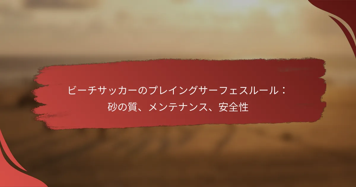 ビーチサッカーには、最適なプレイ環境と選手の安全を確保するために、慎重に管理された砂の表面が必要です。砂の粒子サイズや組成、定期的なメンテナンスの実施などの重要な要素が、安全で楽しいプレイ環境を作るために不可欠です。さらに、危険検査や応急処置の準備を含む安全対策を実施することは、試合中の選手の怪我を防ぐために重要です。 ビーチサッカーの表面に必要な砂の品質要件は何ですか? ビーチサッカーの表面には、選手の安全と最適なプレイ環境を確保するために特定の砂の品質が必要です。重要な要素には、粒子サイズ、組成、確立された基準に従ったメンテナンスの実施が含まれます。 最適なプレイ環境のための理想的な粒子サイズ ビーチサッカー用の砂の理想的な粒子サイズは通常0.5 mmから1.5 mmの範囲です。このサイズは、適切な排水を可能にし、選手が走ったり動いたりするための安定した表面を提供します。粒子が細かすぎると圧縮されて硬い表面になり、逆に粗すぎる砂は不安定さを引き起こす可能性があります。 適切な粒子サイズを維持することは、選手の安全とパフォーマンスにとって重要です。適切に配合された砂の混合物は、トラクションを向上させ、怪我のリスクを減少させることができます。砂の品質について定期的に評価を行い、最適な範囲内に保つことが必要です。 砂の組成とパフォーマンスへの影響 砂の組成は、そのパフォーマンス特性に大きな役割を果たします。耐久性と風化への抵抗性から、主に石英で構成された砂が好まれます。貝殻の破片や有機物などの他の材料は、プレイ中の砂の挙動に影響を与える可能性があります。 異なる組成は、硬さやトラクションの異なるレベルを引き起こすことがあります。例えば、粘土含量が高い砂は水分を保持し、泥状になることがありますが、砂利の割合が高い砂は不均一なプレイ表面を作ることがあります。砂の組成を定期的に監視することは、最適なプレイ条件を維持するために不可欠です。 砂の品質に影響を与える環境要因 天候、湿度、温度などの環境要因は、砂の品質に大きな影響を与える可能性があります。雨は細かい粒子を洗い流し、粒子サイズの分布を変え、プレイ環境に影響を与えることがあります。高温は砂の圧縮を引き起こし、選手にとって硬くて扱いにくい表面を作ることがあります。 さらに、沿岸侵食や潮の変動は、砂に異物を持ち込む可能性があり、品質を損なうことがあります。これらの課題に対処し、安全なプレイ表面を確保するためには、定期的なメンテナンスと環境評価が必要です。 ビーチサッカーで使用される一般的な砂の種類 ビーチサッカーで使用される一般的な砂の種類には、耐久性と一貫した粒子サイズが好まれるシリカ砂があります。他の選択肢には、貝殻の破片や製造された砂が含まれ、独自のプレイ特性を提供することができますが、より頻繁なメンテナンスが必要になる場合があります。 各種の砂にはそれぞれ利点と欠点があります。シリカ砂は一般的により安定しており、メンテナンスも容易ですが、他の種類は美的な利点や特定のパフォーマンス特性を提供することがあります。適切な種類の選択は、地域の入手可能性やプレイ表面の特定のニーズに依存します。 砂の品質に関する規制機関の基準 FIFAなどの規制機関は、ビーチサッカーにおける砂の品質に関する基準を確立しています。これらの基準は通常、選手の安全と公正なプレイを確保するために、許容される粒子サイズ、組成、メンテナンスの実施を指定しています。公式競技を開催するためには、これらのガイドラインに従うことが不可欠です。 定期的な検査とこれらの基準の遵守は、プレイ表面の整合性を維持するのに役立ちます。主催者は、規制機関の規則に準拠していることを確認し、選手に安全な環境を提供するために、砂の品質評価の文書を保持する必要があります。 ビーチサッカーの表面はどのように維持すべきですか? ビーチサッカーの表面を維持することは、選手の安全と最適なプレイ条件を確保するために重要です。定期的な維持管理には、砂をレーキングし、侵食に対処し、メンテナンス活動中に安全対策を実施することが含まれます。 砂の維持管理のための定期的なメンテナンス実施 砂の表面を良好な状態に保つためには、定期的なメンテナンスが不可欠です。砂をレーキングすることで、プレイエリアを平らにし、怪我を引き起こす可能性のある硬く圧縮された部分を防ぐことができます。さらに、貝殻や石、ごみなどのデブリを取り除くことは、選手の安全にとって重要です。 表面を平らにするための毎日のレーキング。 清潔なプレイエリアを確保するための週ごとのデブリ除去。 硬く圧縮された部分や不均一な表面の定期的な検査。 表面維持のために必要な道具と機器 効果的な砂のメンテナンスには、適切な道具と機器が必要です。ビーチレーキは砂を平らにし、通気