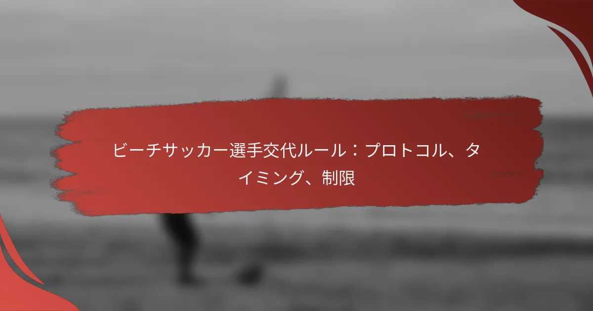 ビーチサッカーでは、試合中の選手交代に関する特定のプロトコルがあり、スムーズな移行を促進します。交代はプレーの中断時に行うことができ、チームはゲームの流れを維持しながら戦術的な変更を実施できます。さらに、試合ごとに許可される交代の回数には制限があり、競技によって異なるため、チームはこれらのルールを理解することが効果的な管理と戦略にとって不可欠です。 ビーチサッカーにおける選手交代の公式プロトコルは何ですか? ビーチサッカーには、試合中のスムーズな移行を確保するための選手交代に関する特定のプロトコルがあります。これらのプロトコルは、交代がどのように、いつ行われるかを定めており、明確なコミュニケーションとルールの遵守の重要性を強調しています。 試合中の交代の開始 ビーチサッカーでは、交代はプレーの中断時にいつでも行うことができ、チームは戦略的に選手を交代させることができます。コーチやチームキャプテンは通常、選手を交代させる意図を示し、審判が今後の変更を認識できるようにします。 選手は、通常サイドラインに沿ってマークされた指定の交代ゾーンでフィールドに入ったり出たりしなければなりません。これにより、ゲームの流れが維持され、選手交代時の混乱を防ぎます。 交代に必要な合図と通知 交代を開始するために、チームは審判に通知するための明確な合図を使用しなければなりません。これには、手を挙げるか、特定のジェスチャーを使って、どの選手がフィールドを離れ、誰が入るのかを示すことが含まれます。 さらに、全ての公式や選手が交代を認識できるように、口頭での通知も行われることがあります。この実践は、誤解のリスクを最小限に抑え、ゲームの整合性を維持します。 交代プロセスにおける審判の役割 審判は選手交代を監督する重要な役割を果たし、確立されたプロトコルに従っていることを確認します。彼らは交代を承認し、選手の変更のタイミングを監視する責任があります。 審判はまた、選手が適切なゾーンでフィールドに入ったり出たりすることを確認し、試合中の秩序と公平性を維持します。彼らの権限は、交代に関する潜在的な争いを防ぐのに役立ちます。 異なる試合形式における交代手続き ビーチサッカーでは、交代手続きは試合形式によってわずかに異なる場合があります。例えば、親善試合やトーナメントなどです。一般的に、基本的なプロトコルは一貫していますが、トーナメントのルールは許可される交代の回数に追加の制限を課すことがあります。 例えば、一部のトーナメントでは、チームは試合ごとに特定の数の交代に制限される場合がありますが、親善試合ではより柔軟性が許可されることがあります。これらのニュアンスを理解することは、コーチや選手にとって重要です。 交代の文書化と記録管理 交代の適切な文書化は、正確な試合記録を維持するために重要です。チームは通常、選手の変更を追跡する必要があり、各交代の時間や関与した選手を記録します。 この記録管理は透明性を確保し、試合後の分析や争いに役立つことがあります。チームは試合中にこの文書管理を担当する人を指定し、見落としを避けるべきです。 ビーチサッカーの試合中に交代はいつ行われますか? ビーチサッカーでは、交代はプレーの中断時に行うことができ、チームはゲームの流れを妨げることなく戦術的な変更を行うことができます。これらの交代のタイミングと制限を理解することは、効果的な試合管理にとって重要です。 プレーの中断時の交代のタイミング 交代は通常、ボールがプレー外に出たときや怪我の際など、ゲームの自然な中断時に許可されます。これにより、ゲームのペースが維持され、チームは選手をリフレッシュすることができます。コーチはこれらの瞬間を利用して新しい選手を投入したり、戦術的な調整を行ったりすることができます。 選手は審判の合図を認識することが重要であり、交代は遅延を避けるために迅速に実行されなければなりません。選手は交代が行われる前にフィールドを離れなければならず、これにはチームメンバー間の調整とコミュニケーションが必要です。 許可される交代ウィンドウと時間制約 ビーチサッカーでは、試合ごとに限られた数の交代が許可されており、通常はトーナメントの規則に応じて5回から7回程度です。各交代は特定のウィンドウ内で行われる必要があり、通常は中断時に行われ、ゲームが流動的であることを確保します。コーチは選手の効果を最大化するために、戦略的に交代を計画するべきです。 時間制約も重要であり、交代は通常数秒以内に迅速に完了する必要があります。遅延はペナルティや混乱を引き起こす可能性があるため、チームはダウンタイムを最小限に抑えるために効率的な交代技術を練習する必要があります。 試合条件が交代のタイミングに与える影響 極端な暑さや雨などの天候条件は、ビ