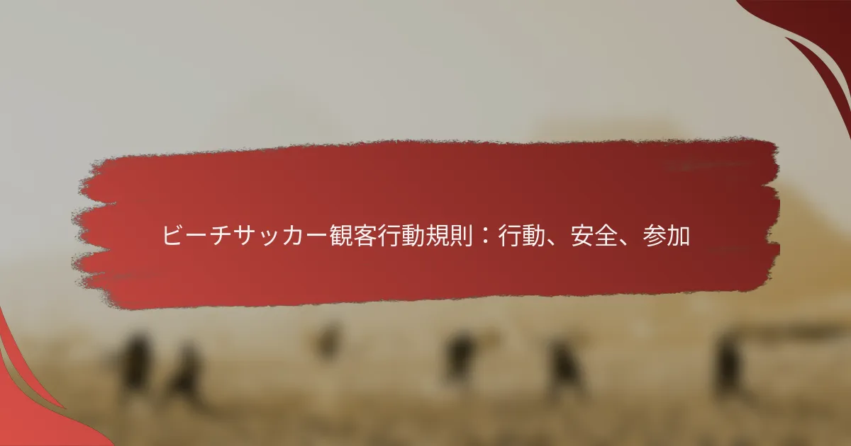ビーチサッカーの観客は、選手や審判と敬意を持って関わりながら、全員にとって安全な環境を確保することで、ポジティブな雰囲気を作る重要な役割を果たします。水分補給をし、日差しから身を守り、安全に気を配ることで、ファンは自分自身と他の人々の体験を向上させることができます。さらに、地域活動に参加し、他のサポーターとつながることで、これらのイベントでの帰属意識と興奮を育むことができます。 ビーチサッカーの観客に期待される行動は何ですか? ビーチサッカーの観客は、ポジティブに関与し、選手や審判を尊重し、全員にとって安全で楽しい環境を維持することが期待されています。良い行動は、ファンとアスリートの両方にとって体験を向上させ、スポーツマンシップとコミュニティの精神を促進します。 チームへの応援とサポートの受け入れ チームを応援することは、ビーチサッカーの体験において重要な部分です。ポジティブなサポートは選手に活力を与え、関わる全員にとって uplifting な雰囲気を作り出します。 “頑張れチーム!”や”あなたならできる!”のような励ましのフレーズを使いましょう。 ゴールや素晴らしいプレーなどの重要な瞬間に拍手や歓声を上げましょう。 チームの旗を持参したり、チームカラーを身に着けて応援を示しましょう。 応援は敬意を持って行い、攻撃的または侮辱的と見なされる可能性のある言葉は避けることを忘れないでください。これにより、全ての観客にとって友好的な環境が維持されます。 選手や審判とのインタラクション 選手や審判との関わりは敬意を持って行うべきです。意見を表現することは自然ですが、ポジティブな雰囲気を促進する方法で行うことが重要です。 両チームの良いプレーに拍手を送り、スキルや努力に感謝の意を示しましょう。 判定に異議がある場合でも、審判には敬意を持って接しましょう。 建設的なフィードバックは貴重ですが、サポートのトーンで伝えるべきです。侮辱的な言葉を叫んだり、侮辱的なコメントをすることは避けましょう。これにより、敵対的な環境が生まれる可能性があります。 他の観客のスペースを尊重する 個人のスペースは、全員にとって快適な観戦体験を維持するために重要です。周囲に気を配ることで、全ての観客が混雑や不快感を感じることなく試合を楽しむことができます。 座っている観客の前に立ったり、視界を遮ったりすることは避けましょう。 自分の持ち物は指定されたエリア内に保管し、他の人のスペースを侵害しないようにしましょう。 他の人に配慮することで、イベント全体の楽しみが向上します。移動する必要がある場合は、周囲の人に配慮しながら丁寧に行動しましょう。 妨害行為や野次を避ける 選手や審判に対する野次などの妨害行為は、試合の楽しみを損ないます。全ての参加者にとって敬意を持った雰囲気を維持することが重要です。 攻撃的な言葉やジェスチャーは控えましょう。 他の観客や審判と口論しないようにしましょう。 代わりに、チームを応援し、試合を楽しむことに集中しましょう。フラストレーションを感じた場合は、ネガティブなコメントではなく、ポジティブな応援にそのエネルギーを向けましょう。 ファン間のスポーツマンシップを促進する ファン間のスポーツマンシップを促進することは、ビーチサッカーイベントでのポジティブな環境に寄与します。敬意を持った行動を奨励することで、若い観客に良い模範を示し、コミュニティの精神を育むことができます。 自分のチームの成功だけでなく、相手チームの良いプレーも称賛しましょう。 他のファンにもポジティブでサポート的に関与するよう促しましょう。 敬意と励ましの文化を育むことで、試合に関わる全ての人にとって体験を向上させる歓迎する雰囲気を作る手助けができます。 観客はビーチサッカーイベントでの安全をどのように確保できますか? 観客は、水分補給をし、日差しから身を守り、一般的なビーチの危険を理解し、緊急手順を把握し、安全でない行動を報告することで、ビーチサッカーイベントでの安全を確保できます。これらの実践は、個人の安全を向上させるだけでなく、全ての参加者にとってポジティブな環境に寄与します。 暑い天候での水分補給 水分補給は、特に暖かい天候のビーチサッカーイベントで重要です。観客は定期的に水を飲むべきで、活動レベルや気温に応じて、毎時少なくとも500mlを目指しましょう。脱水症状は、疲労、めまい、熱中症を引き起こす可能性があります。 口の渇き、疲労、濃い尿などの脱水症状の兆候に注意を払いましょう。自分や他の人にこれらの症状が見られた場合は、すぐに水分補給を促しましょう。イベント中に水にアクセスできるよう、再利用可能な水筒を持参するのが賢明です。 イベントの前、最中、後に水を飲みましょう。 過剰なカフェインやアルコールは脱水を引き起こす可能性があるため避け