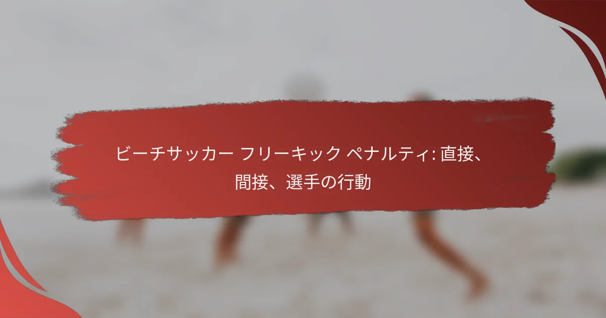 ビーチサッカーにおいて、フリーキックは試合の結果に大きな影響を与える重要な要素です。直接フリーキックは特定のファウルに対して選手がゴールに直接シュートを打つことを許可しますが、間接フリーキックは得点する前にボールが他の選手に触れる必要があります。さらに、選手の行動はこれらのキックの実行において重要な役割を果たし、ルールを守ることでフェアプレーとフィールド上の規律が促進されます。 ビーチサッカーにおける直接フリーキックの主要なルールは何ですか? ビーチサッカーにおける直接フリーキックは特定のファウルに対して与えられ、選手はゴールに直接シュートを打つことができます。これらのキックに関するルールを理解することは、選手や審判がフェアプレーと試合中の適切な実行を確保するために不可欠です。 直接フリーキックの定義と状況 直接フリーキックは、選手がプレーを中断するほど深刻なファウルを犯した場合に与えられます。このタイプのキックは、選手が他のチームメイトにパスをすることなく直接得点することを可能にします。 直接フリーキックが与えられる一般的な状況には、相手をつまずかせる、押す、または保持するなどのファウルが含まれます。これらの行為はゲームの流れを妨げ、公平性を維持するために罰せられます。 直接フリーキックにつながるファウルの例 ビーチサッカーで直接フリーキックにつながる特定のファウルはいくつかあります。これには以下が含まれます: 相手をつまずかせる 相手を押すまたは保持する 相手を叩くまたは叩こうとする 挑戦において過剰な力を使用する これらの行為はすべてルール違反と見なされ、相手チームに直接フリーキックが与えられます。これらのファウルを理解することで、選手はペナルティを避け、スポーツマンシップを維持することができます。 直接フリーキックの実行ルール 直接フリーキックを実行する際、選手はシュートを打つ前にボールが静止していることを確認しなければなりません。キックはファウルが発生した地点から行うことができ、相手チームはボールがプレーに入るまでボールから少なくとも5メートルの距離を保たなければなりません。 選手は、強力なシュートやより戦略的な配置など、さまざまな技術を使用してキックを行うことができます。選択は通常、ゴールからの距離やゴールキーパーの位置に依存します。 直接フリーキック中の選手の位置取り 直接フリーキック中の選手の位置取りは重要です。キックを行う選手は、ゴールキーパーの位置と相手チームが設定したディフェンスの壁を評価する必要があります。この評価は、直接シュートを打つか、チームメイトにパスを試みるかの決定に影響を与える可能性があります。 チームメイトも、ゴールキーパーの注意を引くために戦略的に位置を取るか、潜在的なリバウンドに備える必要があります。適切な位置取りは、直接フリーキックから得点するチャンスを大幅に増加させることができます。 直接フリーキックに関する一般的な誤解 一般的な誤解の一つは、すべてのファウルが直接フリーキックにつながるということです。しかし、直接フリーキックが与えられるのは特定のファウルのみであり、他のファウルは間接フリーキックにつながる場合があります。 もう一つの誤解は、選手が笛の後すぐに直接フリーキックを行うことができるということです。実際には、ボールは静止している必要があり、相手チームはキックを実行する前に必要な距離にいる必要があります。 ビーチサッカーにおける間接フリーキックの主要なルールは何ですか? ビーチサッカーにおける間接フリーキックは特定のファウルに対して与えられ、得点する前にボールが他の選手に触れる必要があります。これらのキックの状況と実行を理解することは、選手やコーチがゲームを効果的に進めるために不可欠です。 間接フリーキックの定義と状況 間接フリーキックは、特定の違反に対して与えられる再開の一種であり、得点する前にボールが他の選手に触れなければなりません。このキックは、直接フリーキックと比較して、通常は軽度のファウルに対して与えられます。 間接フリーキックが与えられる一般的な状況には、危険なプレー、妨害、または選手がスポーツマンシップに反する行動をした場合が含まれます。さらに、ゴールキーパーがボールを持ちすぎるなどの違反を犯した場合にも間接フリーキックが与えられます。 間接フリーキックにつながるファウルの例 相手に接触せずに蹴ろうとするなどの危険なプレー。 ボールなしで相手の進行を妨げる妨害。 ペナルティエリアの外でボールを扱うゴールキーパーの違反。 プレーの再開を遅らせるなどのスポーツマンシップに反する行動。 これらのファウルは、フィールド上でのフェアプレーと安全性を維持する重要性を強調しています。選手はこれらの違反を認識し、相手チームに