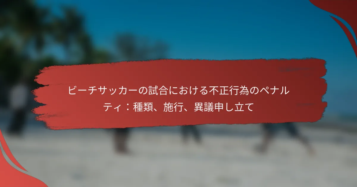 ビーチサッカーでは、公正なプレーを維持することが重要であり、イエローカード、レッドカード、出場停止などの不正行為に対する罰則は、審判が規律を強制するための重要な手段です。これらの罰則はさまざまな違反に対処し、試合の結果に大きな影響を与える可能性があります。さらに、選手やチームは、不正行為の決定に対して異議を申し立てる権利があり、審判の判断に異議を唱えるための特定の手続きを踏む必要があります。 ビーチサッカーにおける不正行為の罰則の種類は何ですか? ビーチサッカーにおける不正行為の罰則は、主にイエローカード、レッドカード、出場停止に分類されます。これらの罰則は、公正なプレーと選手間の規律を維持するために施行されており、それぞれのタイプは試合中の違反に対処するための明確な目的を持っています。 ビーチサッカーにおける不正行為の定義 ビーチサッカーにおける不正行為とは、選手がゲームのルールに違反したり、公正なプレーを妨げたり、他者の安全を脅かしたりする行動を指します。このような行動には、スポーツマンシップに反する行為、暴力的な行動、またはルールの繰り返しの違反が含まれることがあります。不正行為の罰則の施行は、スポーツの誠実性を維持するために重要です。 審判は、試合中に不正行為を特定し対処する責任があり、選手が定められた規則に従うことを確保します。不正行為の重大性は、警告から出場停止のようなより厳しい結果まで、課せられる罰則の種類を決定することがよくあります。 一般的な罰則の種類:イエローカード イエローカードは、軽微な違反を犯したり、スポーツマンシップに反する行動を示した選手への警告として機能します。トーナメント中に複数のイエローカードを累積すると、出場停止を含むさらなる懲戒処分を受ける可能性があります。 最初のイエローカード:軽微な違反に対する警告。 2枚目のイエローカード:レッドカードとなり、試合からの退場につながる。 累積:選手はトーナメント内で設定された数のイエローカードを受け取った後に出場停止を受ける可能性があります。 イエローカードを受ける可能性のある行動の例には、プレーの再開を遅らせること、審判に対する異議申し立て、または無謀なチャレンジが含まれます。選手は、罰則がエスカレートしないように自らの行動に注意を払うべきです。 一般的な罰則の種類:レッドカード レッドカードは、重大な不正行為に対して発行され、試合からの即時退場を意味します。レッドカードを受けた選手は交代できず、チームは数的劣位に置かれます。 直接レッドカード:暴力的な行為、重大なファウルプレー、または攻撃的な言葉を使用した場合に与えられる。 間接レッドカード:選手が試合中に2枚のイエローカードを受けた後に発行される。 レッドカードを受けることは、将来の試合からの出場停止などの追加の制裁につながることがよくあります。選手は、チームの競技機会を守るために、レッドカードを受ける可能性のある行動を避けるべきです。 一般的な罰則の種類:出場停止 出場停止は、重大な違反を犯したり、時間の経過とともに複数の罰則を累積した選手に対して課せられます。出場停止の期間は、不正行為の重大性に応じて異なる場合があります。 例えば、選手はレッドカードに対して1試合の出場停止を受けることがありますが、より深刻な違反は長期の出場停止につながる可能性があります。これらの罰則は、将来の不正行為を抑止し、スポーツの誠実性を維持するために施行されます。 チームは、特に重要な選手が出場停止の場合、ロースターを慎重に管理する必要があります。これは、今後の試合でのパフォーマンスに大きな影響を与える可能性があります。 不正行為の違反の例 ビーチサッカーにおける不正行為の一般的な例には、暴力的なタックル、対戦相手や審判に対する攻撃的な行動、持続的なファウルが含まれます。他の違反には、試合中に不適切な言葉やジェスチャーを使用することが含まれる場合があります。 選手はこれらの行動に注意し、スポーツマンシップを維持するよう努めるべきです。繰り返しの違反は、より厳しい罰則につながる可能性があります。ルールとその結果を理解することで、選手は不必要な制裁を避けることができます。 罰則に影響を与える文脈的要因 ビーチサッカーにおける不正行為の罰則の施行には、いくつかの文脈的要因が影響を与える可能性があります。審判の裁量は重要な役割を果たし、選手の行動の重大性や意図を評価します。 試合の文脈、例えばスコアや試合の重要性も、ルールの施行の厳しさに影響を与える可能性があります。さらに、選手の評判や過去の行動も、審判の意思決定プロセスに影響を与えることがあります。 これらの要因を理解することで、選手は試合をより効果的に進め、罰則のリスクを最小限に抑えることができます。試合環境に基づ